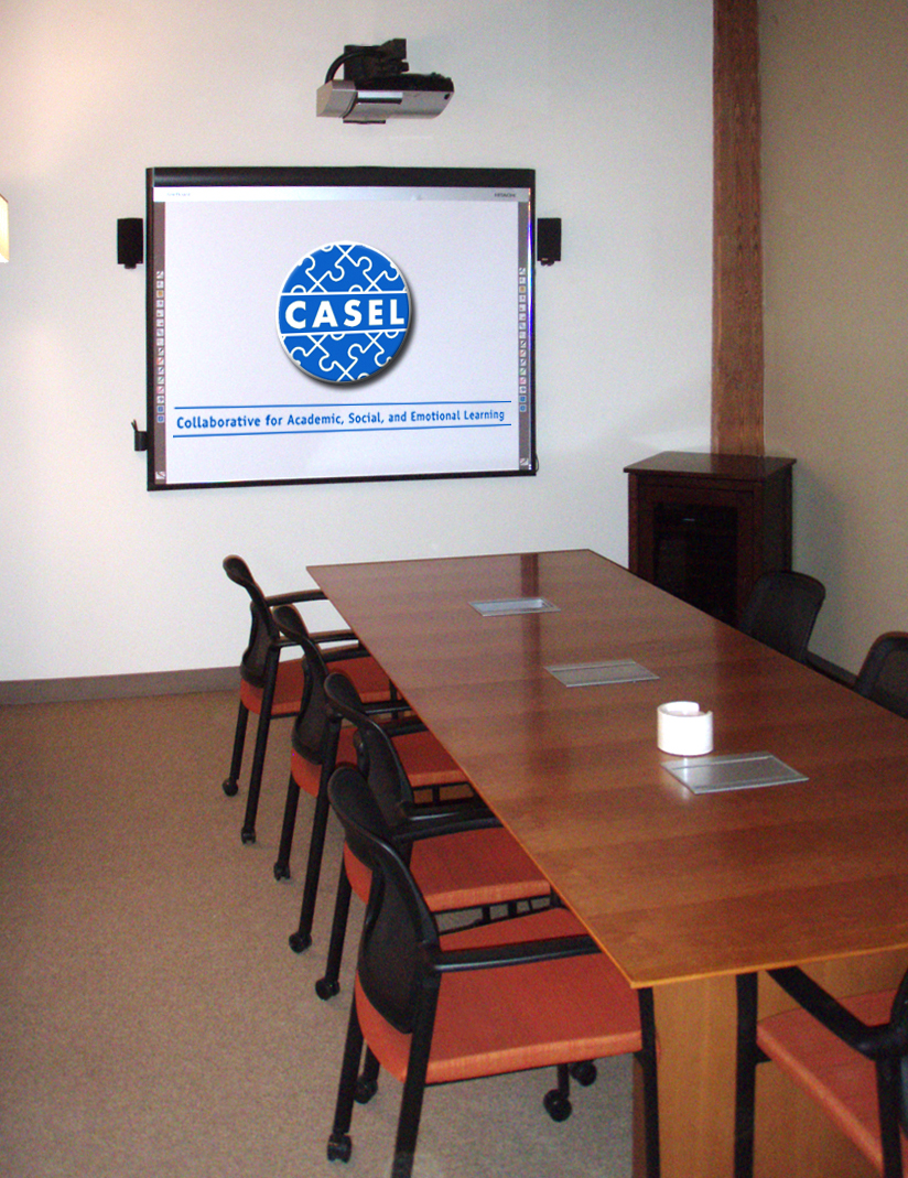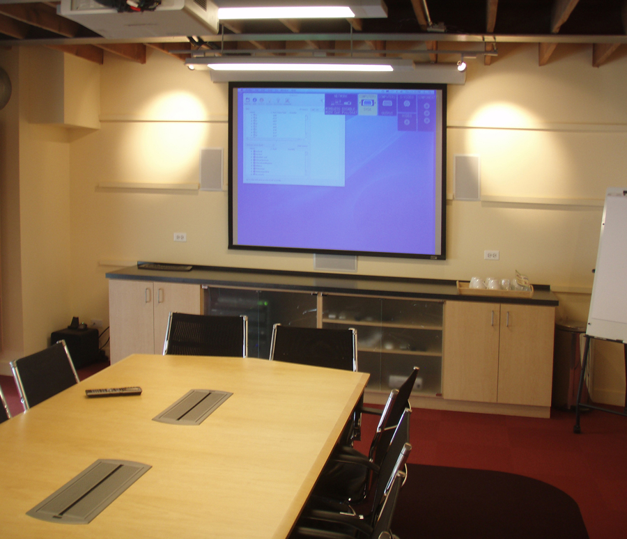 High light output projection for daytime and lights on viewing, motorized screens that retract when not in use, table hidden audio/video and computer connections, a variety of video, computer, audio and other source equipment hidden and racked in nearby cabinetry or in adjacent equipment closets, and easy to use controls so everyone in the office can be self reliant and immediately productive in the conference room.